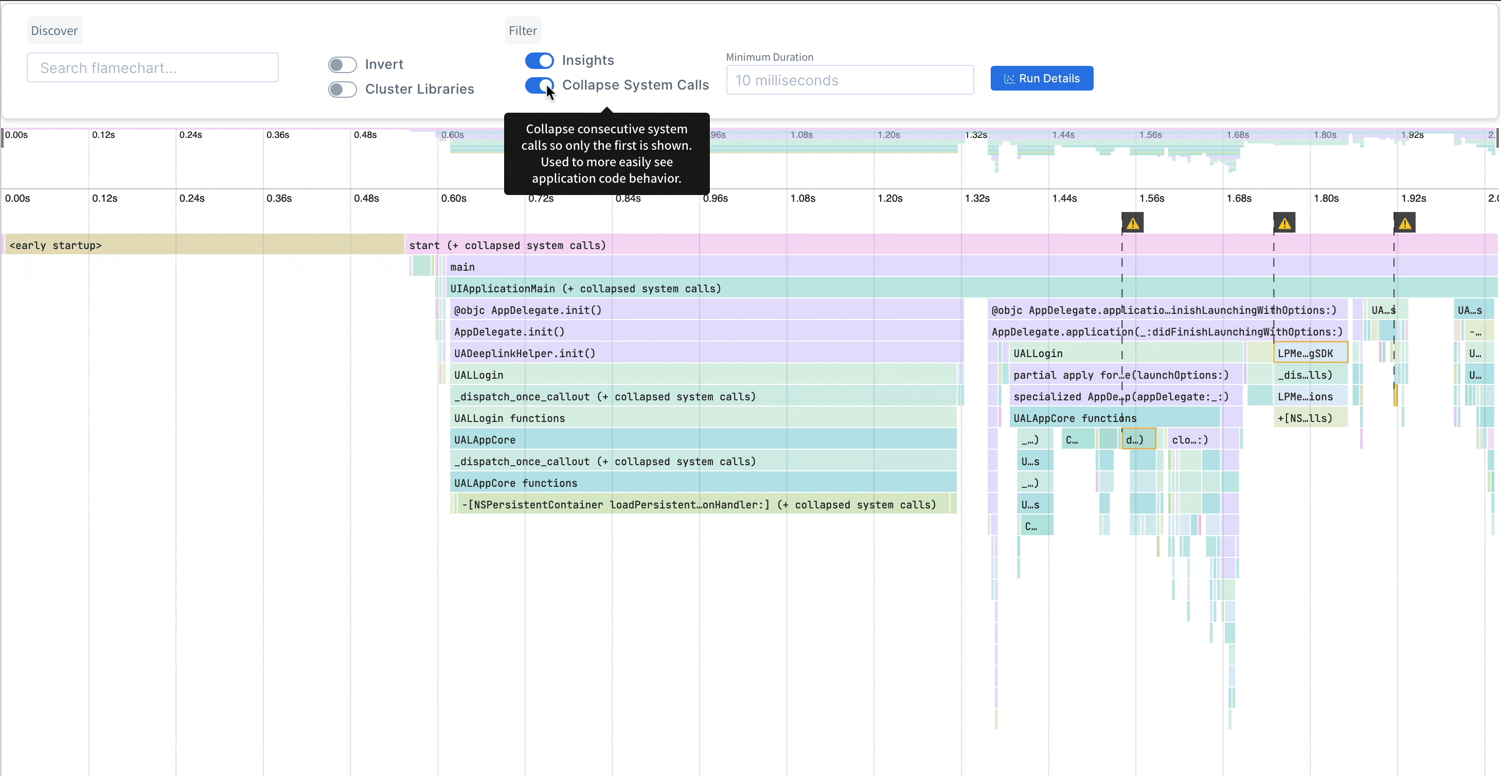You might wonder why not just use Instruments for this? While the Time Profiler is the state of the art for iOS profiling, it can be difficult to use without being a performance expert (and even for performance experts). This is partly due to the non-intuitive visualizations, but also due to the unwieldy nature of the tool.